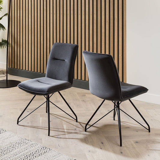Set of 2 Velvet Dining Chairs - Grey Velvet, Black Metal Legs