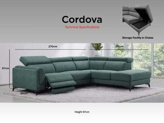 Cordova green fabric electric recliner corner sofa. Available in left or right hand corner.