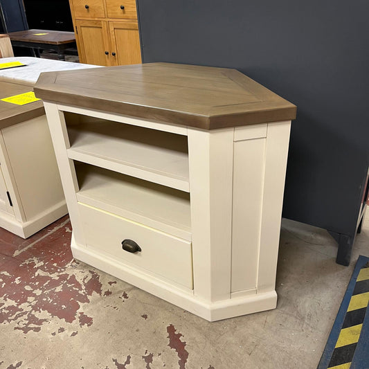 Corner TV Stand Cream Base Wood Top 1 Drawer