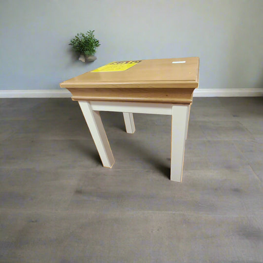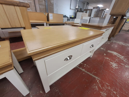 Ivory TV stand, oak top. 2 doors, large open media centre