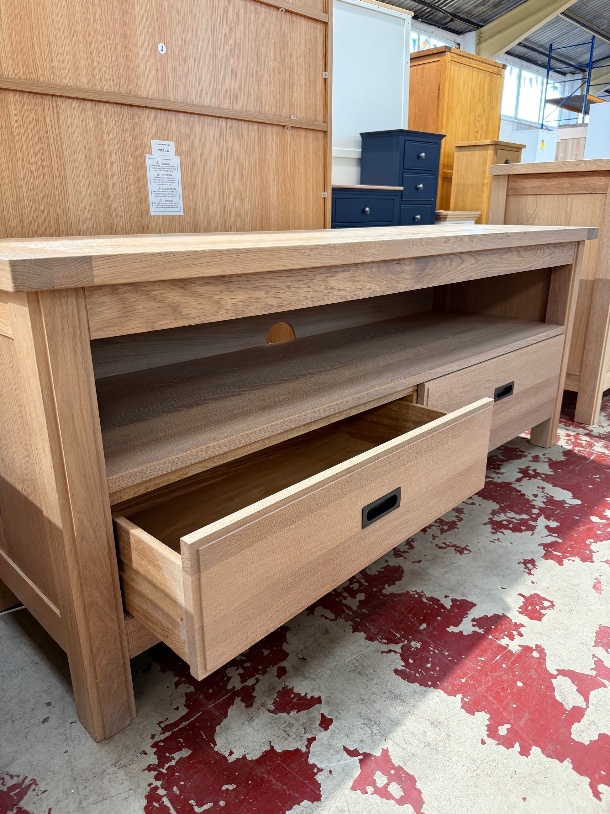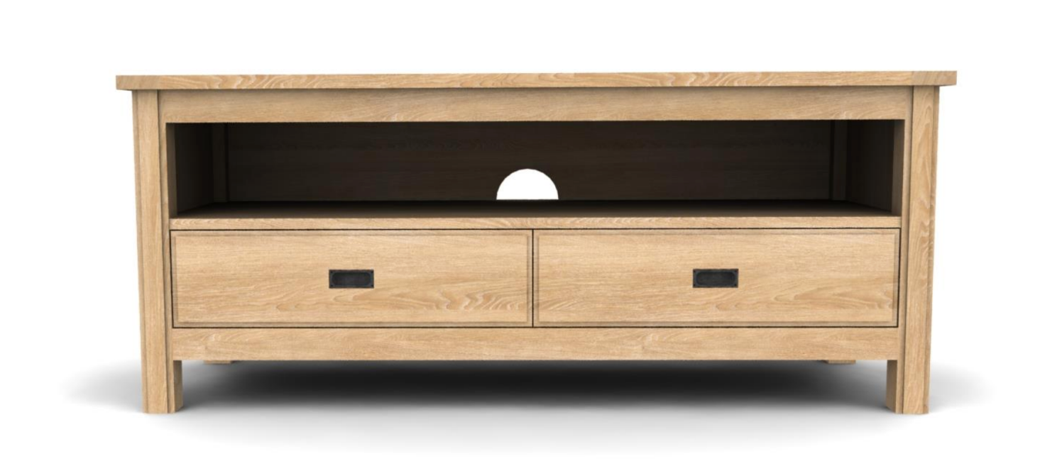 Albany Oak TV media unit featuring two drawers and an open storage shelf.